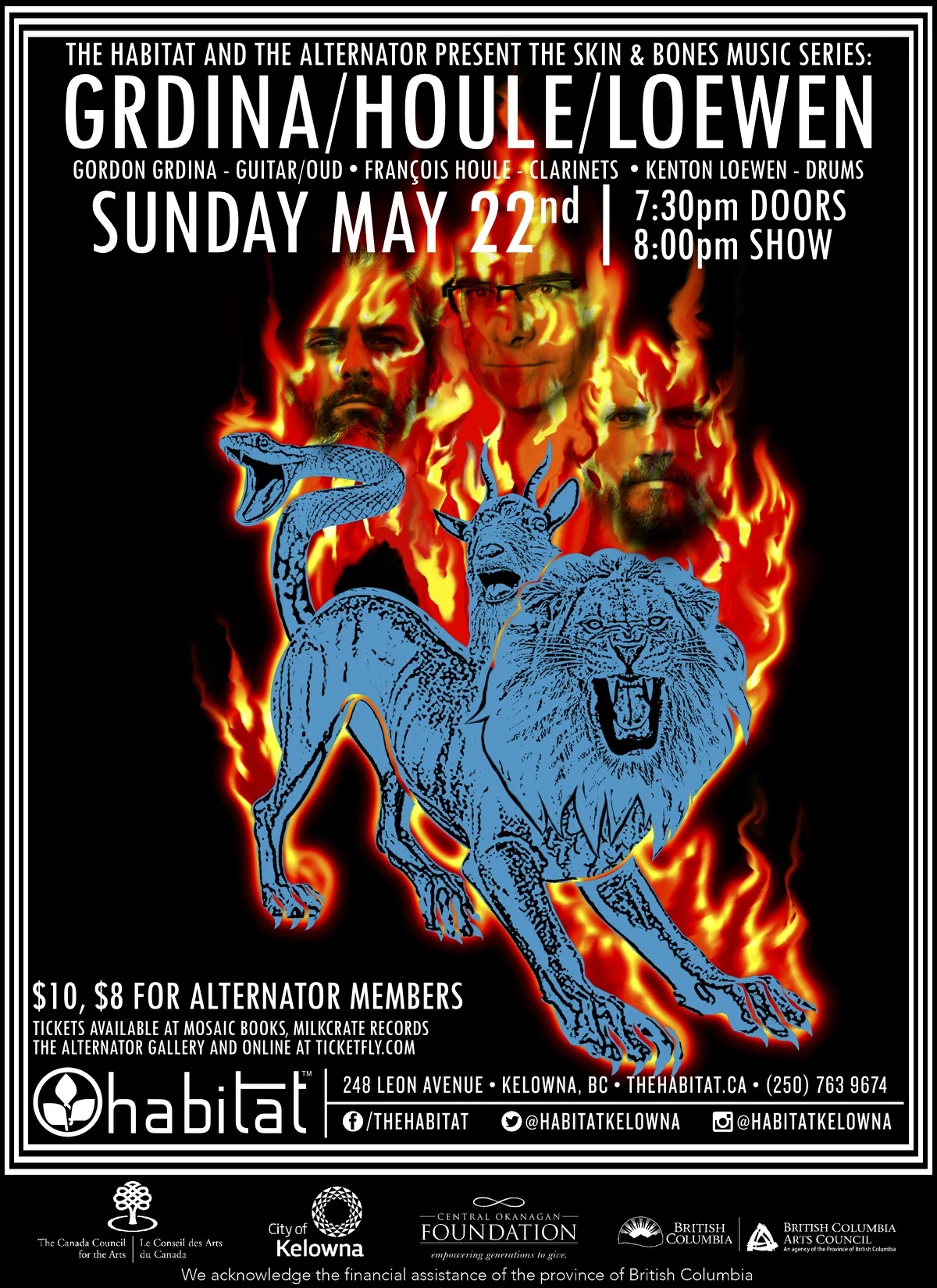 The electrifying trio of Grdina/Houle/Loewen will be performing on May 22nd at The Habitat in Kelowna, BC. The performance is the eighth installment of the Skin And Bones Music Series: a new concert series devoted to the presentation of experimental music in the Okanagan, co-produced by the Alternator Centre for Contemporary Art. This concert marks Skin And Bones’ one year anniversary.